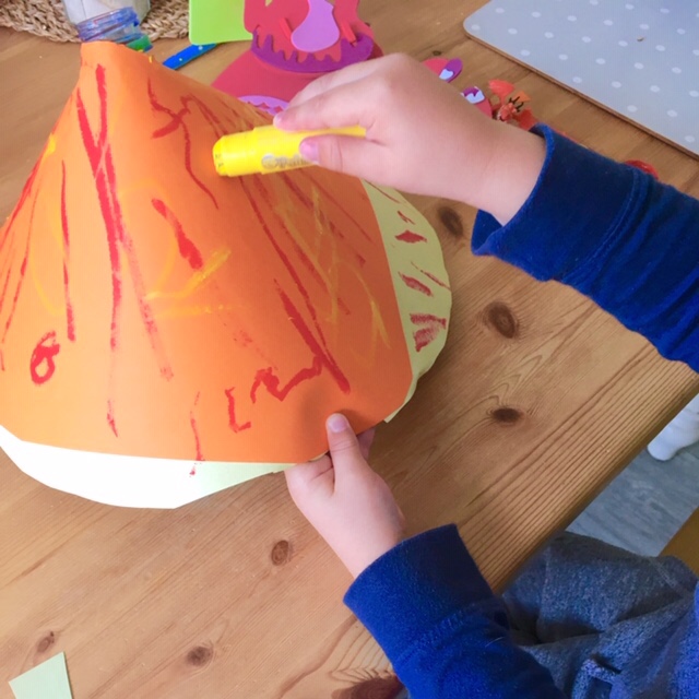 James has been very interested in volcanoes & we have watched Andy’s dinosaur adventures on CBeebies where he was looking for pumice stone which James now knows is made from cooled lava! This gave us the idea to make our own erupting volcano! We made & decorated our own volcano then used bicarbonate of soda, water, food colouring & washing up liquid, mixed them together & watched the reaction! James then had fun playing land of the dinosaurs, making a rocky landscape and helping the dinosaurs escape from the hot lava!